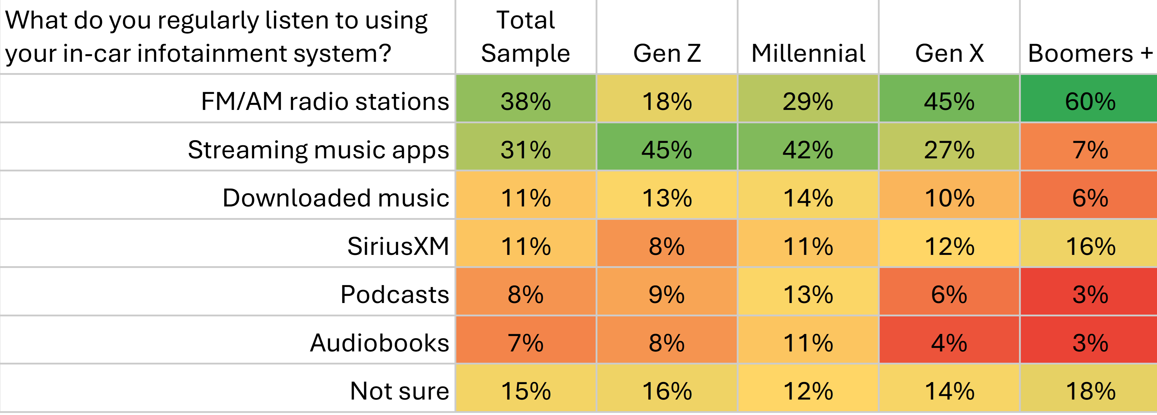 Nearly a quarter of our sample represented this Gen X couple where nearly half regularly use broadcast radio in the car (as shown in the table below, where broadcast radio usage ebbs substantially among the two generations younger than Gen X). The car dealer for these Gen Xers spent plenty of time explaining options to purchase SiriusXM or the commercial-free version of a pureplay streaming service – but gave only a quick mention of the car’s HD radio (and nothing about how to use it). The couple naturally wanted to know how to figure out what’s on the HD channels of stations in the area and how to access those channels.