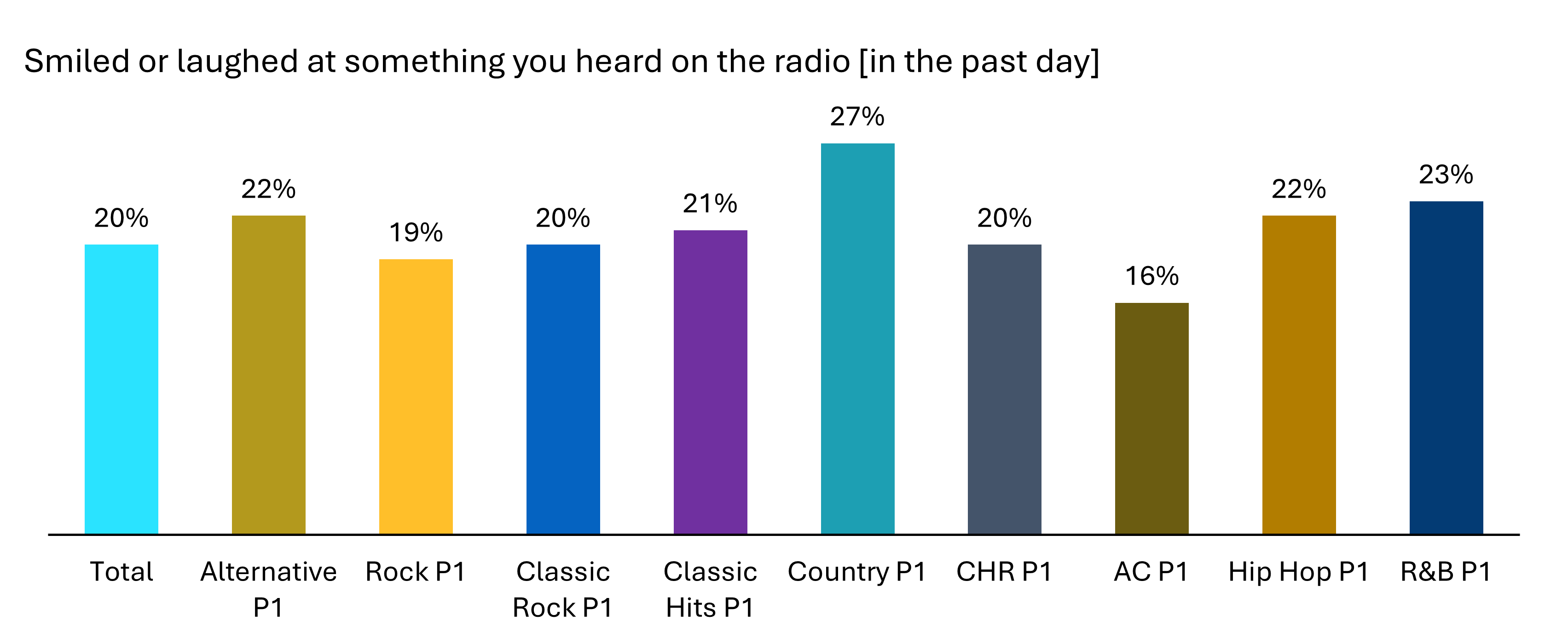 Even when we set the bar no higher than “smiled or laughed at something you heard on the radio,” only 20% of the sample in NuVoodoo Ratings Prospects Study 26 said that had happened “in the past day.” Country P1s were the most likely to recall a laugh or smile in the past day – and it’s only 27% there, as shown in the chart above.